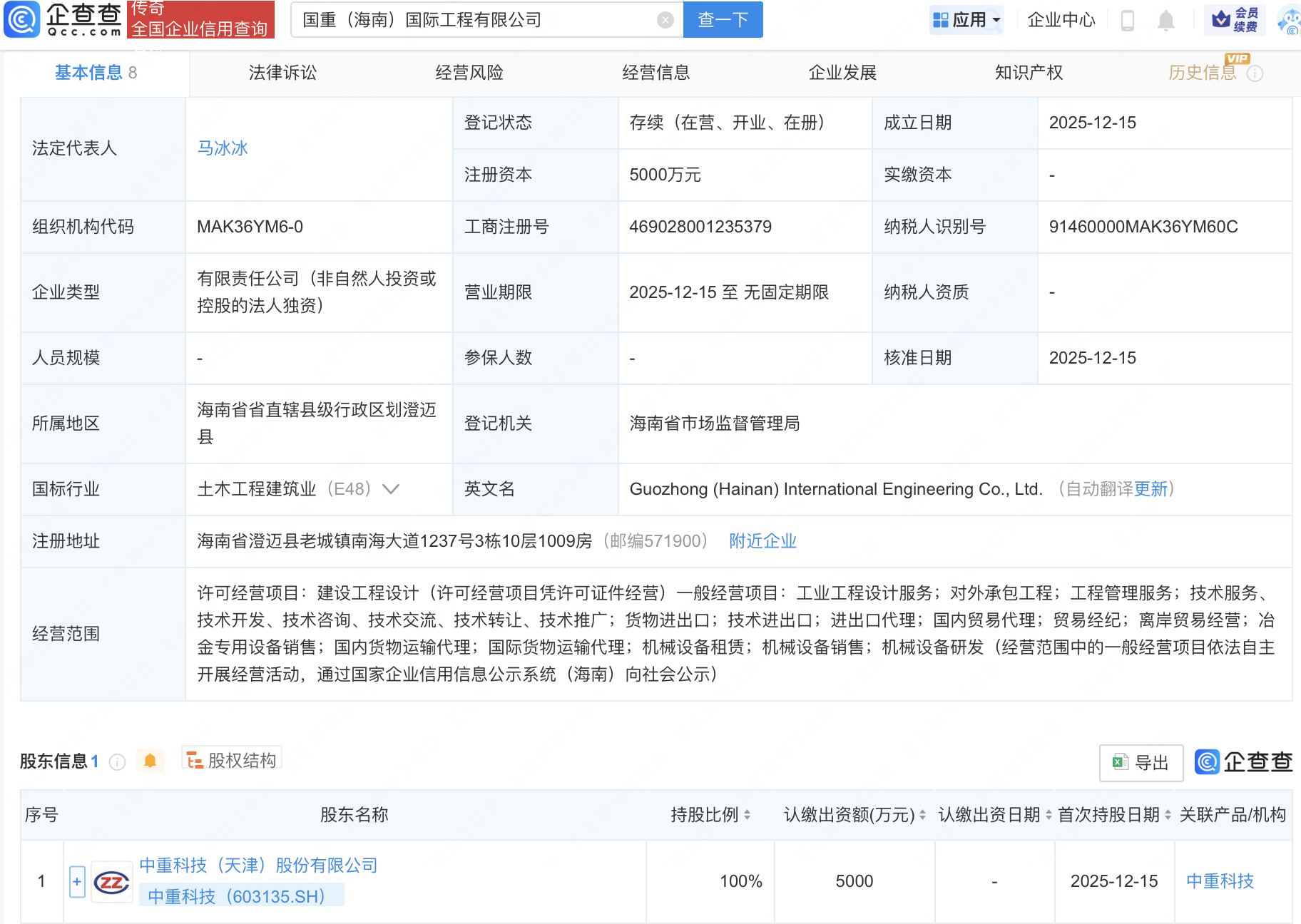 近日,国重(海南)国际工程有限公司成立,注册资本5000万元,经营范围包含:国内贸易代理;贸易经纪;离岸贸易经营;冶金专用设备销售等。企查查股权穿透显示,该公司由中重科技(603135)全资持股。
